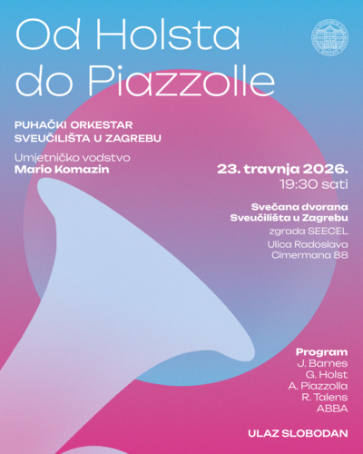 U četvrtak 23. travnja 2026. u 19.30 sati u svečanoj dvorani Rektorata Sveučilišta u Zagrebu održat će se koncert Puhačkog orkestra Sveučilišta u Zagrebu pod nazivom Od Holsta do Piazzolle. Orkestar će nastupiti pod umjetničkim vodstvom Marija Komazina.